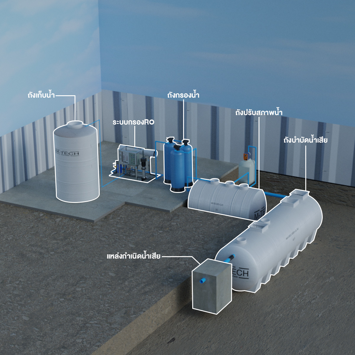 กระบวนการแรกคือการเก็บรวบรวมน้ำเสียจากแหล่งต่างๆ เช่น ห้องน้ำ, น้ำจากการล้างเครื่องจักร, หรือการล้างวัสดุที่ใช้ในกระบวนการผลิต เมื่อรวบรวมได้ครบถ้วน น้ำจะถูกนำไปยัง ระบบบำบัดน้ำเสีย เพื่อเริ่มกระบวนการบำบัด