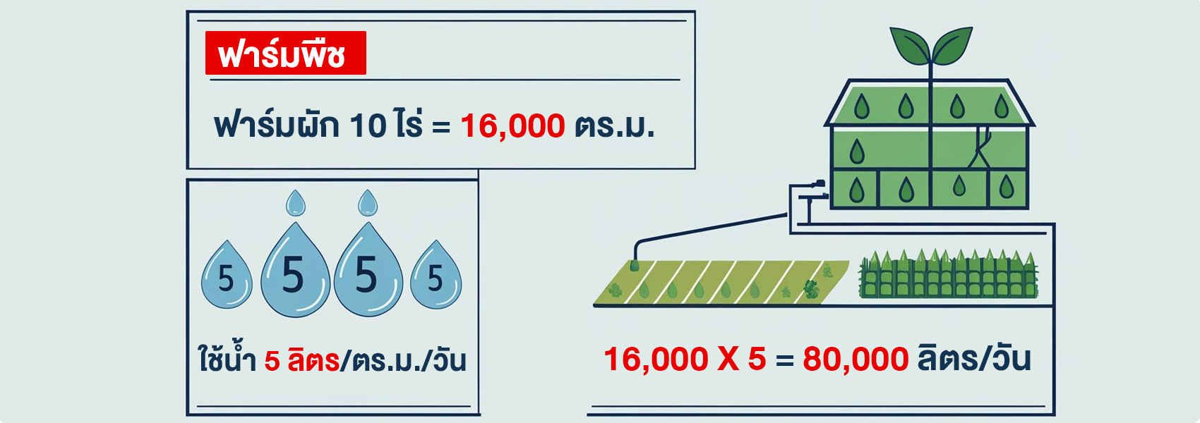 ตัวอย่าง: ฟาร์มผัก 10 ไร่ = 16,000 ตร.ม. ใช้น้ำ 5 ลิตร/ตร.ม./วัน => 16,000 x 5 = 80,000 ลิตร/วัน
