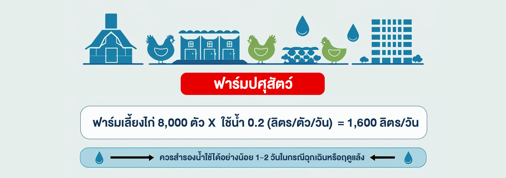 ตัวอย่าง: ฟาร์มเลี้ยงไก่ 8,000 ตัว x 0.2 ลิตร = 1,600 ลิตร/วัน