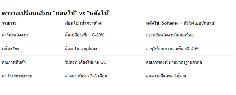 - ควบคุมคุณภาพน้ำได้ต่อเนื่อง → น้ำอ่อนพร้อมใช้ในทุกกระบวนการ