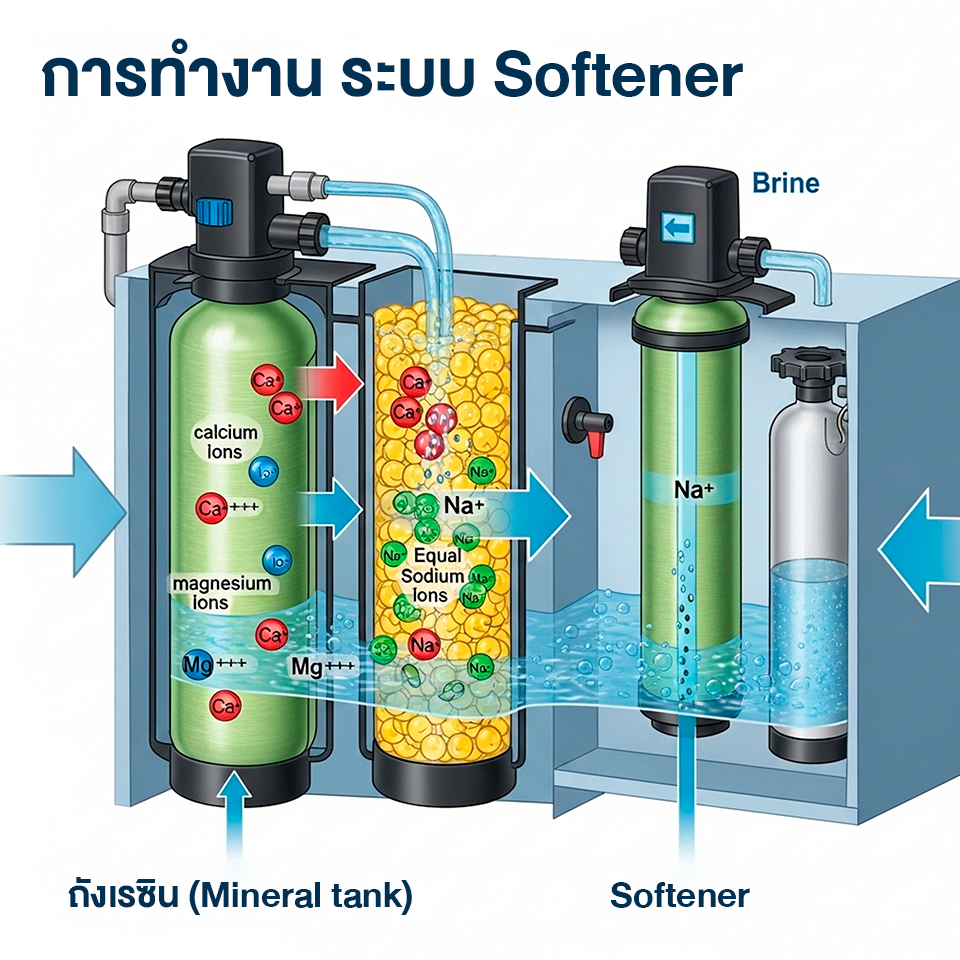 ซอฟเทนนเนอร์เป็นระบบกรองน้ำที่ใช้ เรซินแลกเปลี่ยนไอออน (Ion Exchange Resin) เพื่อลดค่าความกระด้าง โดยดึงไอออน Ca²⁺ และ Mg²⁺ ออกจากน้ำ แล้วแทนที่ด้วย Na⁺ จากเกลือ ส่งผลให้น้ำที่ได้เป็น “น้ำอ่อน” ซึ่งไม่ทำให้เกิดตะกรัน