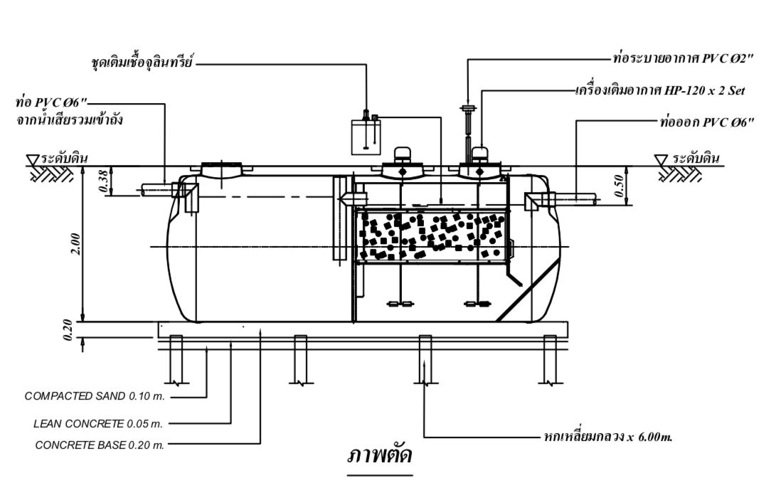 ถังบำบัดน้ำเสียไฟเบอร์กลาส จะเป็นบ่อแรกที่รองรับน้ำเสียจากห้องน้ำ เพื่อทำหน้าที่แยกกากและตะกอนออกจากกัน ให้เหลือเพียงน้ำที่เราต้องการบำบัดเท่านั้น บ่อนี้จะเป็นบ่อเก็บกากที่เรามักจะใช้รถดูดส้วม มาดูดไปกำจัดในระยะเวลา 6 เดือน ถึง 1 ปี นั้นเอง เมื่อน้ำเสียไหลลงบ่อนี้แล้ว น้ำที่ถูกแยกกากและตะกอนแล้วจะไหลผ่านท่อ ขนาด 6 นิ้ว ล้นไปยังบ่อที่ 2 คือบ่อเติมอากาศ ถังบำบัดน้ำเสียจะถูกออกแบบท่อภายในมาแล้ว และภายในถังจะแบ่งเป็นช่องชัดเจน